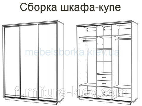Як правило, шафи-купе, як і всі меблі, збираються в лежачому положенні шафи. Уважно вивчіть схему збірки шафи купе. Найчастіше всі деталі шафи і фурнітура мають своє позначення. Так само важливо дотримуватися послідовності складання шафи, зазначеної у схемі. В іншому випадку може виникнути необхідність розібрати скріплені раніше деталі і заново збирати в потрібній послідовності.